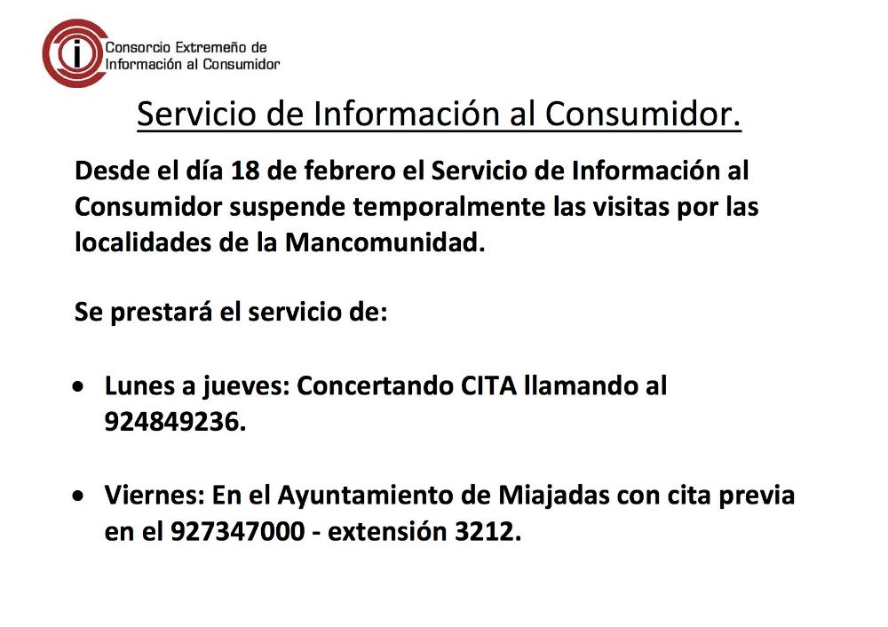 Desde el día 18 de febrero el Servicio de Información al Consumidor suspende temporalmente las visitas por las localidades de la Mancomunidad.